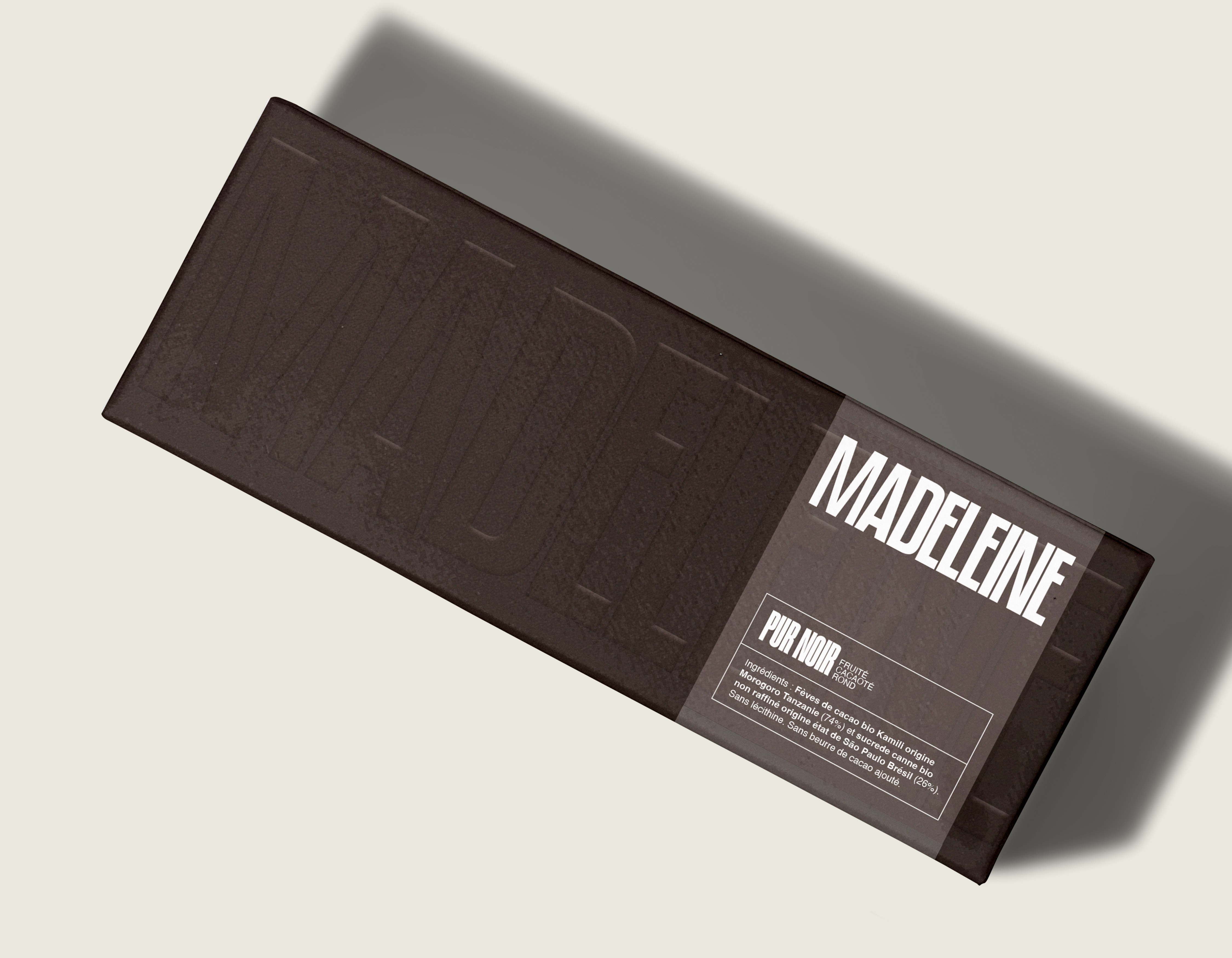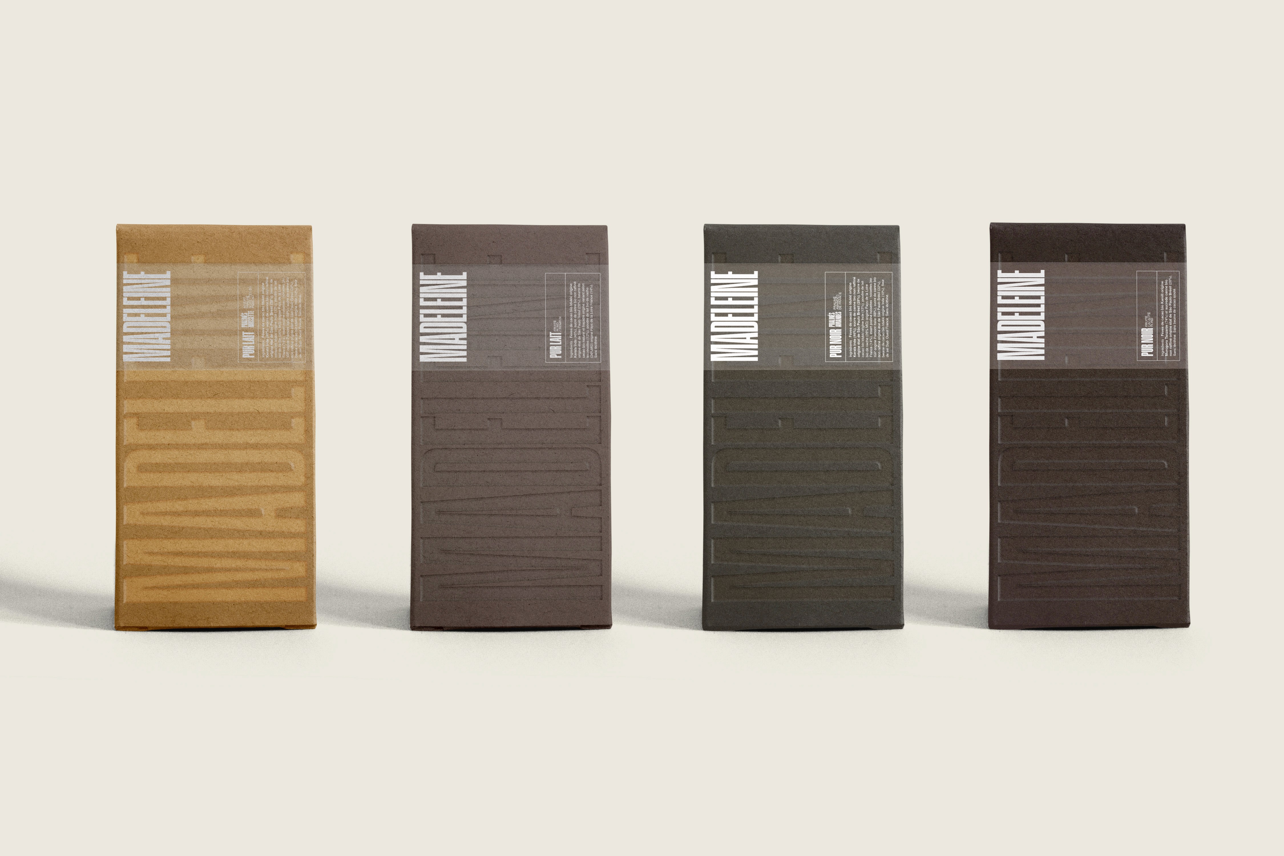 Créer une gamme de packagings pour MADELEINE, c’est imaginer un écrin raffiné pour sublimer une collection complète de chocolats : rochers, tablettes et barres. Un design craft et embossé, associé au jeu du calque pour révéler avec délicatesse la transparence et la qualité des ingrédients.